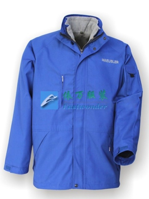 款式說明:拉鏈式上衣,保暖內(nèi)膽可拆卸。腰側(cè)兩口袋,在胸前及其它地方可印繡客戶自定義的LOGO圖標,服裝面料顏色可任選。